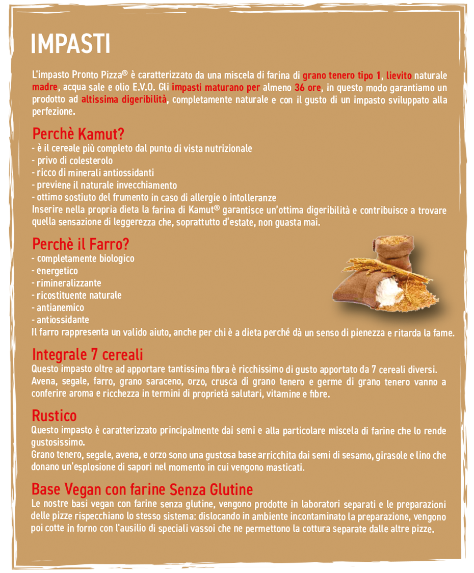 L'impasto Pronto Pizza® è caratterizzato da una miscela di farina di grano tenero tipo 1, lievito naturale madre, acqua sale e olio E.V.O. Gli impasti maturano per almeno 36 ore, in questo modo garantiamo un prodotto ad altissima digeribilità, completamente naturale e con il gusto di un impasto sviluppato alla perfezione.